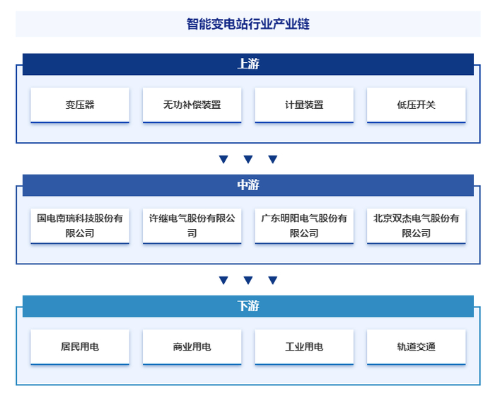 智能变电站产业链上游包括电力设备、智能组件、软件等原材料,其中,电力设备包括变压器、无功补偿装置、计量装置、低压开关等;智能组件包括控制单元、测量单元、通信网络、状态监测单元等。产业链中游为智能变电站装备及解决方案。产业链下游为智能变电站应用场景,包括居民用电、商业用电、工业用电、轨道交通、虚拟电厂等。