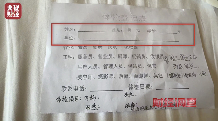 在辽宁省健康产业集团华晨医院办理健康证时,甚至男女互换身份,仍然可以通过体检,办出正规的健康证。医院的体检表上没有体检人员的照片,能体现个人信息的只有手写的姓名、性别和年龄。