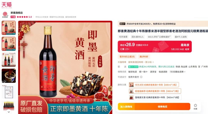 其中,销量最高的是26.9元/瓶的经典十年陈酿,可用来做阿胶糕、固元膏,显示已售出9000+,在天猫甜味黄酒热卖榜排名第7。