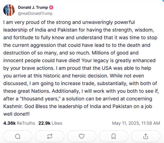 特朗普还赞扬了印巴两国领导人的停火决定,并再次邀功称,是美国的帮助使得他们做出了这一历史性的决定。