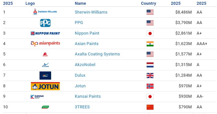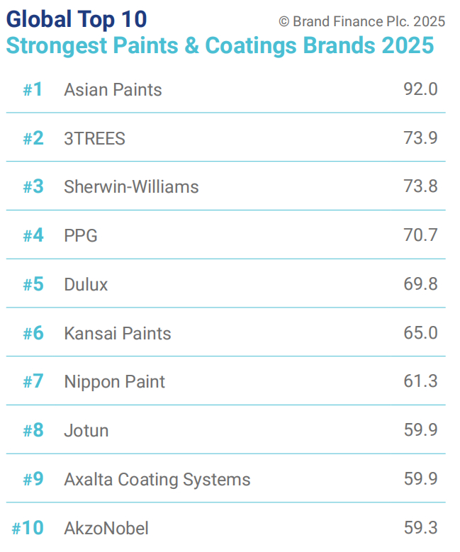 【聚焦】2025全球十大最具价值涂料品牌揭晓:宣伟/立邦/多乐士/三棵树登榜