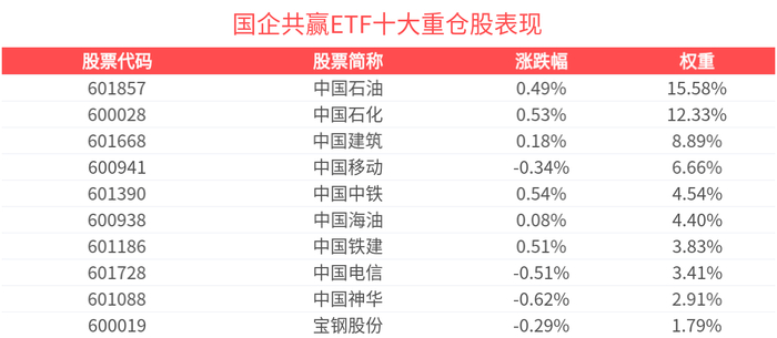 国企共赢ETF(159719)紧密跟踪富时中国国企开放共赢指数,指数由100只成分股构成,包括80个A股公司和20个在香港上市的中国公司。该指数前十大成分股均为“中字头”股票,包括中国石油、中国石化、中国建筑、中国移动(A、H股)、中国铁建、中国海油、中国中铁、中国海洋石油、中国神华。