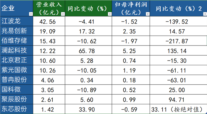 受此影响,在记者统计的十家存储芯片相关上市公司(包含存储芯片、存储控制芯片、存储模组)中,营业收入、归母净利润皆为正且均实现同比增长的企业仅有三家,分别为兆易创新、澜起科技、聚辰股份。营收同比下滑的企业有4家,净利润亏损企业有3家,净利润同比下降企业有五家。多数企业的盈利增长面临压力。