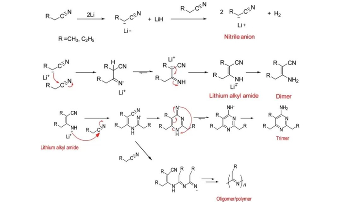 实际应用中同时发现,单腈中的α-H易与Li形成一种Li+(R-CN)-络合物。充放电过程中,该络合物会持续攻击其他腈分子最终形成一系列可溶性二聚体、三聚体及低聚物,导致电化学性能快速衰减,其反应过程如图2所示。相比之下,二腈及多腈分子的电子分布更加均匀,其增强的分子内或分子间作用力使得结构更加稳固,因而更易发生交联反应,在锂金属表面形成不溶性保护膜,抑制其与腈分子发生反应。尽管如此,二腈及多腈溶剂的缺陷在于-CN数量的增加需要延长碳链长度,使得化合物黏度随之增长,影响锂盐解离。同时,其还可能导致空间位阻过大,降低分子在正极表面的覆盖度,限制-CN的吸附和保护膜形成,从而影响电化学性能。
