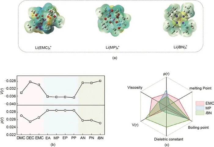 (a) 优化后的Li+与EMC、MP和iBN的四配位溶剂化结构,(b) Li+-O(N)在不同电解质中键临界点(BCP)处的平均ρ(r)和V(r),(c) EMC、MP和iBN作为电解质共溶剂的六个重要特性的雷达图