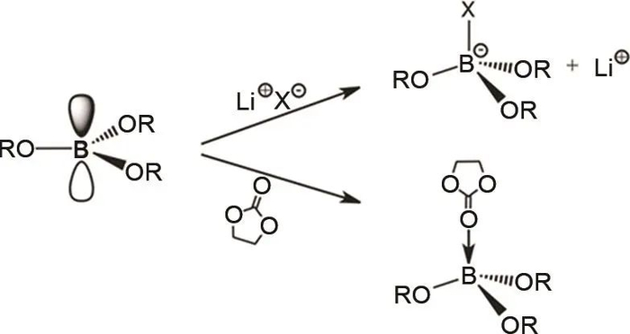 硼酸酯与锂盐 (a)、羰基化合物 (b) 分子间的路易斯酸碱中和反应