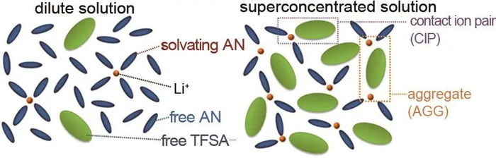 为了提高腈类溶剂与石墨负极和锂金属的兼容性,科学家们进行了较多尝试,常见的有提高腈类电解液中锂盐浓度、腈类与碳酸酯溶剂联合使用形成共溶剂以降低溶剂化能,以及开发含氟腈类电解液和共晶电解质等。