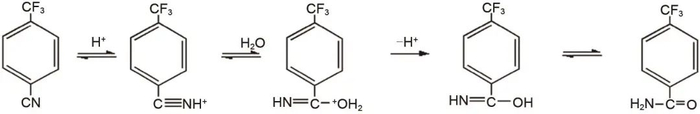 电解液中游离的H质子易攻击-CN中的孤对电子,有效去除电解液中的水分,并抑制电解液中酸度增长。Liao等将含4-(三氟甲基)苯甲腈(4-TB)的电解液储存于55 ℃高温中72 h,观察到该电解液颜色变化较小,酸度值为2356mg/kg,而空白对照组颜色呈深棕色,酸度增长至4386mg/kg。GC-MS结果表明,-CN可与H+结合形成-CNH+并最终转化为-C(NH2)O,从而抑制电解液分解,作用机理如图6所示。