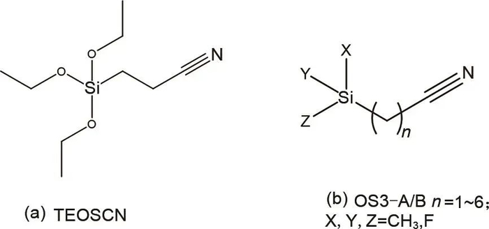 有机硅化合物因其低可燃性、低挥发性、高抗氧化性和绿色环保受到学者们的青睐。硅基添加剂中的Si—N或Si—O键不仅可在高电压正极形成聚合物CEI膜,还能与电解液中的杂质H2O反应,清除HF、PF5等有害物质,同时抑制LiPF6分解。基于此,Figgemeier团队设计了一种新型硅基腈类化合物TEOSCN[结构式如图7(a)所示]。该化合物一方面利用-CN生成富含有机成分的电解质界面膜,另一方面,硅氧烷基团有助于形成有机-无机复合的SEI结构,表现出了更好的机械稳定性和离子导电性。同时,其还能调控电解液中的水分和酸度,提高电解液的高温下稳定性。Guillot等通过使用OS3添加剂[结构式如图7(b)所示]有效减少了60 ℃存储过程NCM622||石墨电池的产气,且与SN相比,该化合物抑制碳酸酯溶剂氧化分解效果更佳。