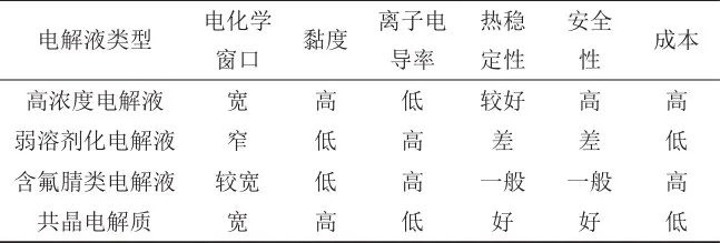高浓度腈基电解液、弱溶剂化电解液、含氟腈类电解液和共晶电解质均有利于显著改善腈类溶剂还原电位高、与锂金属发生聚合反应的弊端,实现高电压下锂离子电池的稳定循环。然而,4种方式各有其优势和弊端,详见表1。腈类溶剂的商业化应用仍任重道远。