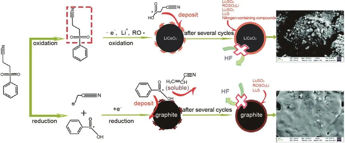 硫元素的价态多、结构多变,根据所连氧原子数量和结构方式的不同可形成较多种类。其中,磺酸内酯和硫酸酯等化合物可在正负极表面成膜,分解产物如Li2S、RSO3Li等离子电导率高,形成的钝化膜富含(CH-CH2-CH2-OSO3Li)2,柔韧度高、负极黏性强、不易脱落,同时还能构建一种三维网状结构,有利于Li+传输。Zheng等通过将磺酰基引入腈类化合物自主合成3,3′-磺酰二丙腈(SDPN)。在-S(=O)2-和-CN两个官能团的作用下,该化合物能够在氧化过程中形成富含ROSO2Li、Li2SO3等无机成分的界面膜,有效抑制了正极材料中过渡金属离子的溶出,同时减少了高电压下电解质的分解反应。Zuo等也探究了一种含苯环和磺酰基的腈类化合物3-(苯磺酰基)丙腈(PSPN),研究发现,由于苯环开环所需能垒较高,充放电过程中磺酰基或氰基与苯环发生断键分离,随后含有效官能团的小分子物质分别在LCO和石墨表面发生氧化和还原反应,产物包括各种含硫锂盐及含S、N的有机成分,其氧化和还原反应如图9所示。这些固体电解质界面膜有效隔离了电极材料与电解质,同时具有较低的界面阻抗,有利于Li+快速脱嵌,从而保证了电池更高的倍率性能和更稳定的循环性能。