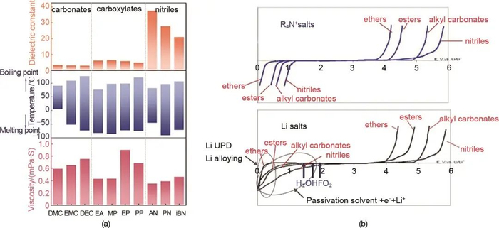 (a) 典型碳酸酯、羧酸酯和腈类溶剂的介电常数、液相范围和黏度,(b) 四丁基铵盐或锂盐在不同种类溶剂中的氧化还原曲线