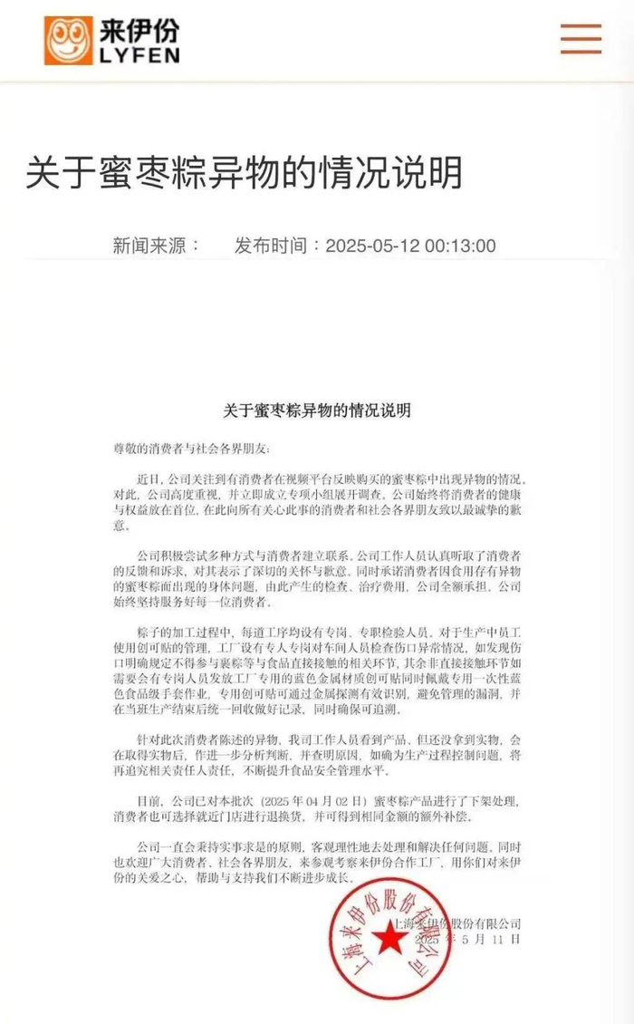 12日凌晨,来伊份在官网发布关于蜜枣粽异物的情况说明,再次做出回应。说明称,近日,公司关注到有消费者在视频平台反映购买的蜜枣粽中出现异物的情况。对此, 公司高度重视,并立即成立专项小组展开调查。