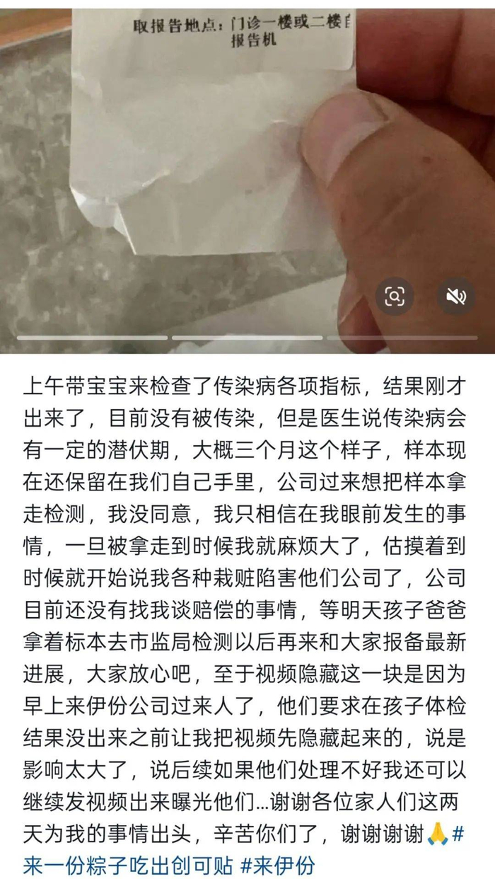 11日下午,该消费者在短视频平台更新事件后续称,11日上午已带小孩去医院检查传染病各项指标,结果显示目前没有被感染。“但医生说传染病大概有潜伏期,大概三个月。公司过来想把样本拿走检测,我没同意。”消费者表示,其家人将于次日(即12日)将上述样品送往市监局检测。
