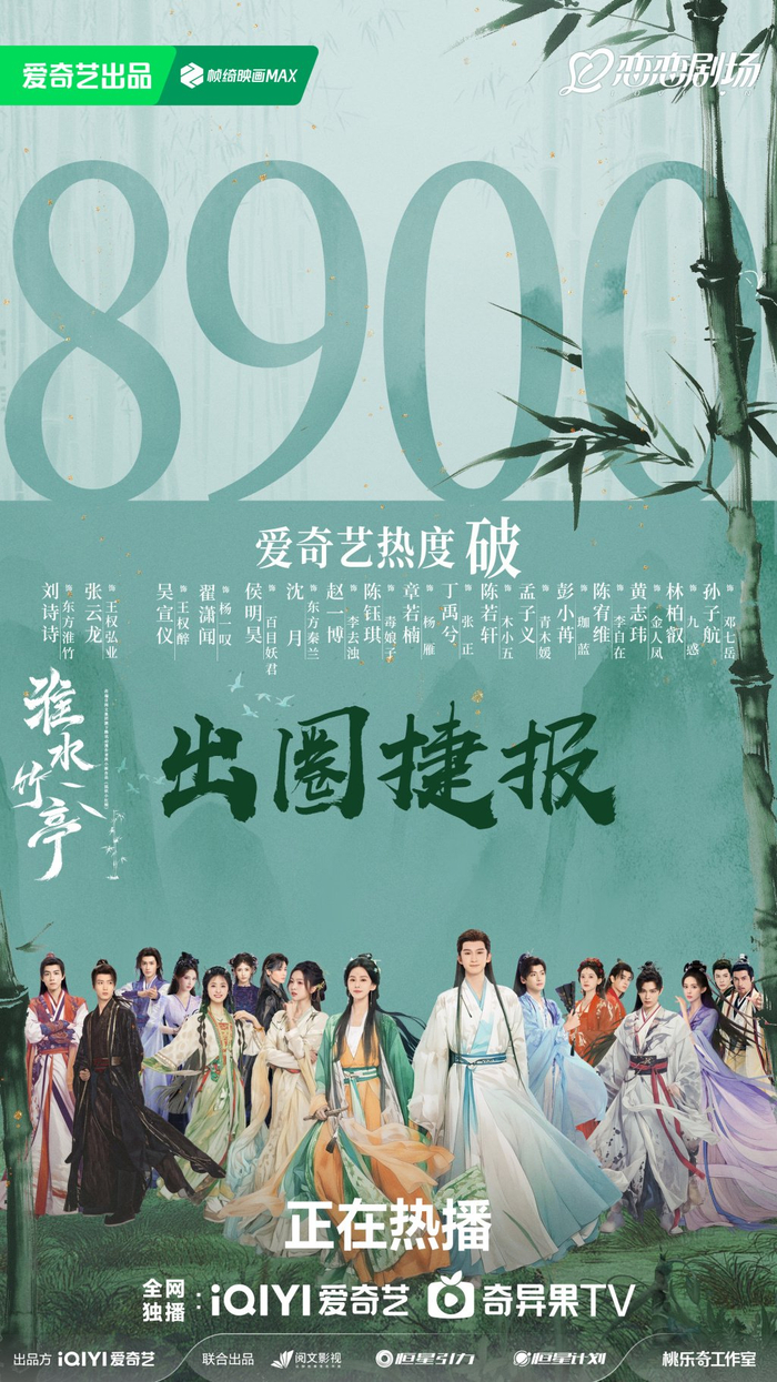 在剧集播出前,其中的一众配角演员,吴宣仪、翟潇闻、侯明昊、沈月、丁禹兮、章若楠、孟子义等,已纷纷在其他剧集上桌,从一开始的“秀人集合”变成如今的“流量开会”,却仍旧没能改变《淮水竹亭》扑街的命运。