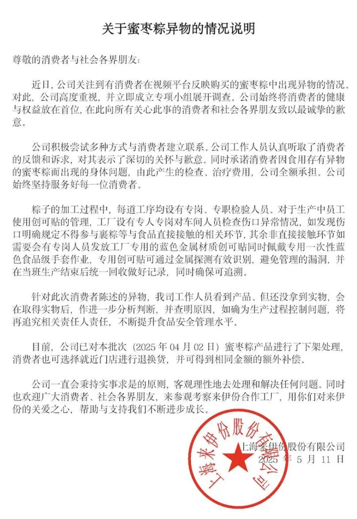 5月12日凌晨,来伊份发布关于蜜枣粽异物的情况说明:公司关注到蜜枣粽中出现异物的相关情况。已积极尝试多种方式与消费者建立联系,公司工作人员认真听取了消费者的反馈和诉求,对其表示了深切的关怀与歉意。同时承诺消费者因食用存有异物的蜜枣粽而出现的身体问题,由此产生的检查、治疗费用,公司全额承担。