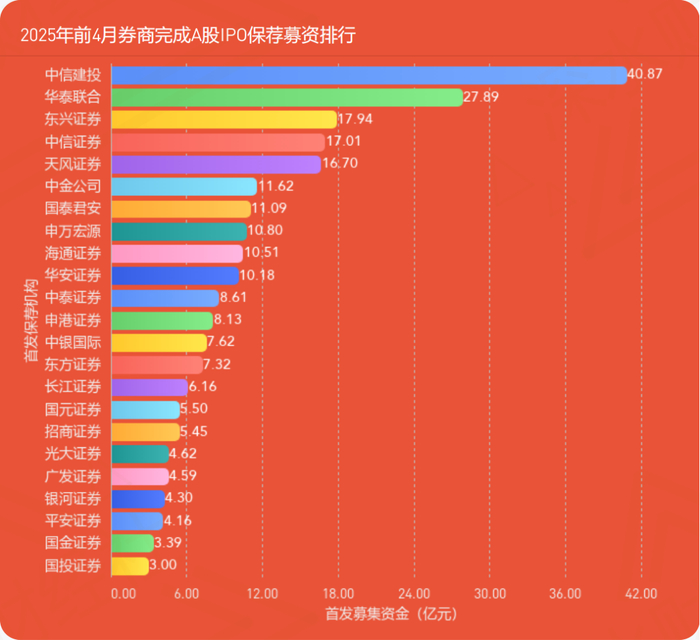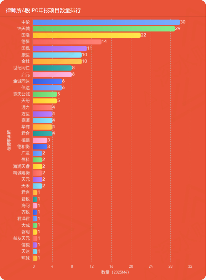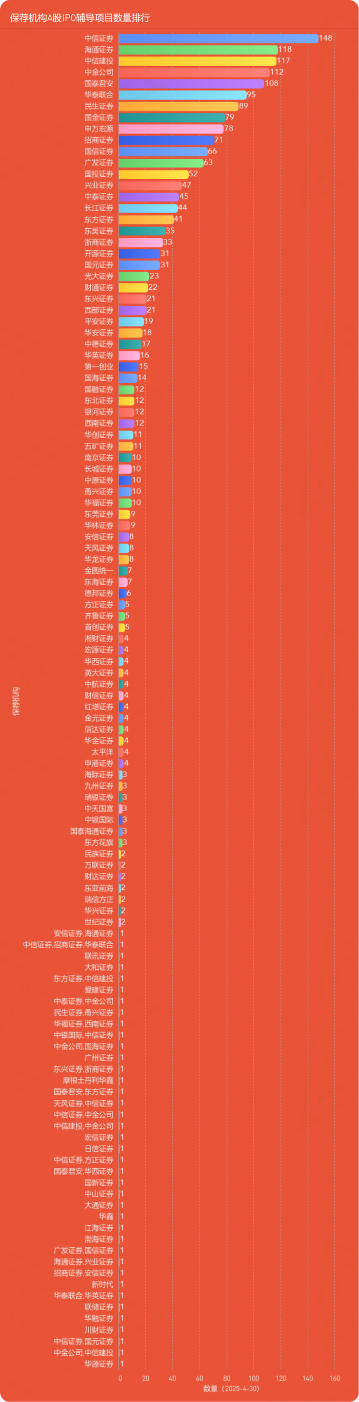 今天发布的是【2025年前4月中介机构A股IPO上市、申报、辅导数量排行榜】。