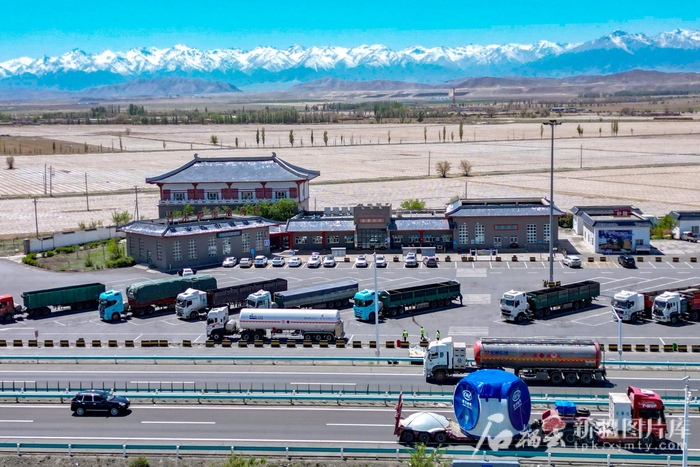 5月9日,京新高速吉木萨尔服务区,车辆在服务区停靠。