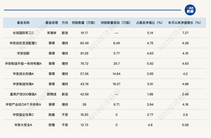 在这其中,持有中航成飞基金数量最多的公司是华安基金,其中多只基金都由蒋璆管理。持股数量最多的单只基金则是长信基金旗下的长信国防军工,截至一季度末合并持股91.17万股,该基金5月以来净值增长了7.27%。