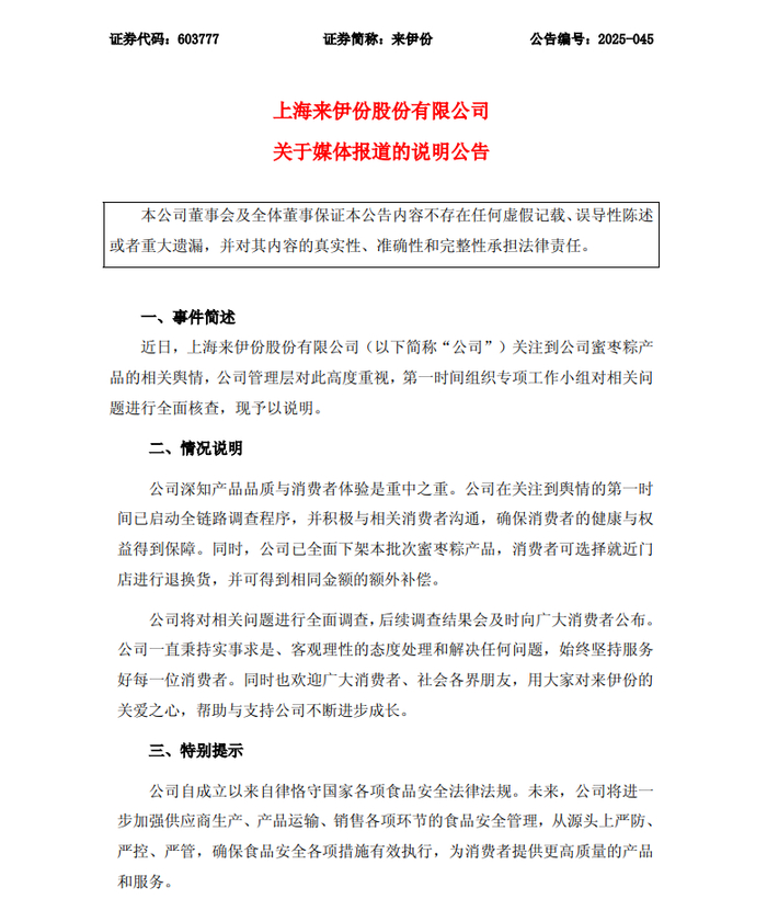 5月12日凌晨,来伊份发布公告,表示已全面下架本批次蜜枣粽产品,消费者可选择就近门店进行退换货,并可得到相同金额的额外补偿。同时,公司承诺消费者因食用存有异物的蜜枣粽而出现的身体问题,由此产生的检查、治疗费用,公司全额承担。