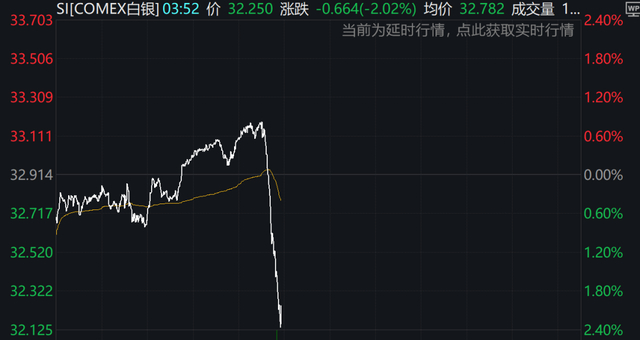 COMEX白银主力合约也跟跌,最新跌幅为2.02%,报32.250美元/盎司。