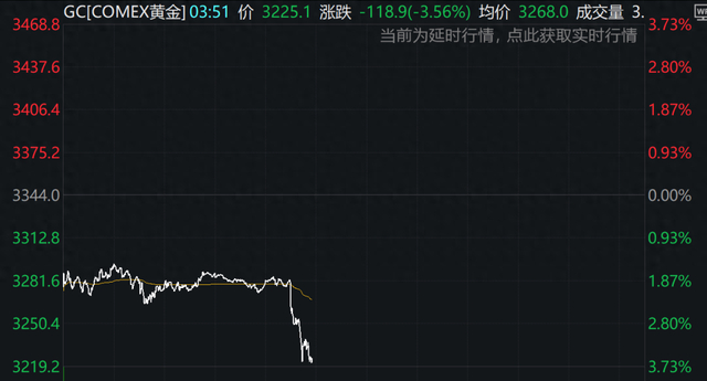 截至发稿,COMEX黄金主力合约跌超3%,最新报3225.1美元/盎司,日内跌超110美元。