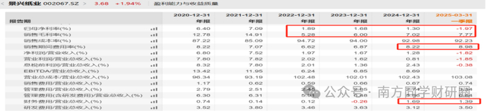 先看公司的经营状况,自22年开始,公司收入增长开始停滞,利润大幅下滑,,毛利率骤降近10个百分点,净利率不到2%,较2021年下滑了5个百分点,2025年一季度,公司更是遭遇了有史以来单季度最大幅度的亏损。造纸业作为中游制造业,上游原材料价格波动和下游市场需求的疲软,使得景兴纸业的经营压力倍增。