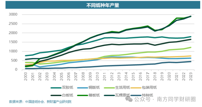 景兴纸业的下游主要是大宗纸中的包装纸,其周期性较强,对消费需求高度敏感。箱板/瓦楞纸作为工业包装用纸,占据了整个造纸行业的半壁江山,但近年来整体需求却在放缓。2023年-2024年,箱板、瓦楞纸的年产量虽然保持在5600吨左右的稳定水平,但新增产能却因需求疲软而较少。