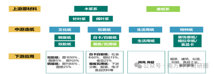 造纸业属于中游制造业,上游原材料主要有纸浆系与废纸系两大类,下游应用涵盖大宗纸(文化、包装、生活)、特种纸等不同需求。