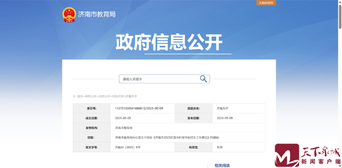 5月9日,济南市教育局官方网站发布《济南市2025年高中阶段学校招生工作意见》(以下简称《意见》)。《意见》提到,为做好济南市2025年高中阶段学校招生工作,依据山东省教育厅关于2025年中小学招生入学有关要求及《济南市教育局关于印发济南市2025年初中学生毕业评价及学业水平考试实施意见的通知》(济教办〔2025〕3号)精神,现就高中阶段学校招生工作提出如下工作意见(莱芜区、钢城区高中阶段学校招生工作意见另文公布,以下文中所指“全市”不包含莱芜区、钢城区)。