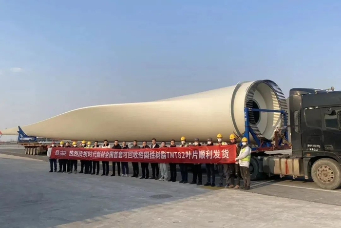 在江苏,射阳中车风电叶片工程有限公司的厂区内,一支82米的风机叶片格外引人注目,它正是国内首套可回收热固性树脂的风机叶片。这种叶片在通过了工艺性能以及叶片的动态载荷模拟测试等60余项严苛验证后,即将发往风场。