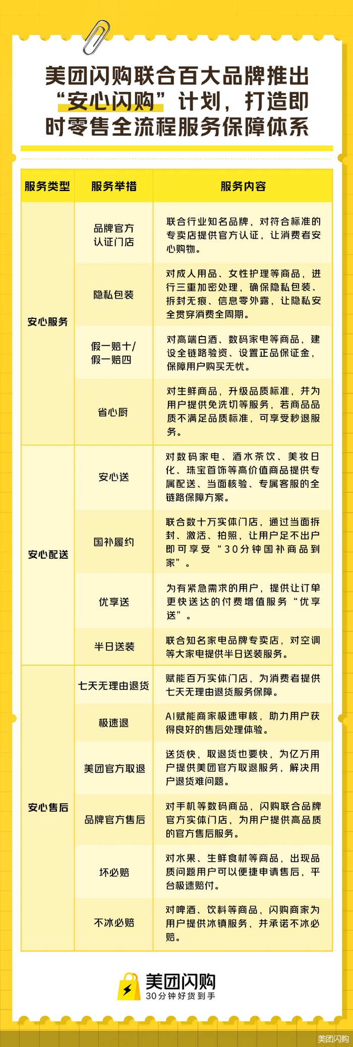 售后保障方面,在已推出7天无理由退货等常规售后保障举措的基础上,美团闪购联合大润发、全棉时代、永辉超市、北京华联、百威、和路雪等品牌及本地实体商家,升级多项安心售后服务,包括对全品类商品提供美团官方取退服务;助力商家建立极速处理退款能力,通过“极速退”服务确保用户获得极致快速的售后处理体验;联合3C品牌,对手机等高价值数码产品上线品牌官方售后认证;对水果、生鲜食材提供“坏必赔”服务;对啤酒、水饮、雪糕等应季冰品提供不冰必赔、融化必赔的极致购物体验。