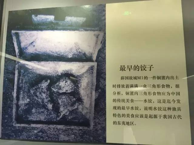 1978年,中国社科院考古研究所在在滕州市薛国故城进行考古,发掘的9座薛国墓葬中,共出土各类随葬铜器919件。在该墓出土的一套青铜礼器中,有一个锈蚀的铜器,里面整整齐齐排放着一些白色食品。它们为个体三角形,内包有屑状馅料。经专家判断,盛放食品的器物是青铜簠,主要是用来祭祀用的,这里面的食物,就是今天的饺子或者馄饨的鼻祖。