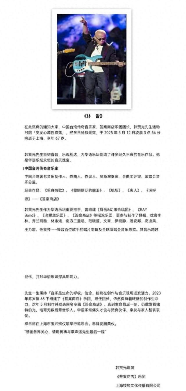 5月12日,中国台湾音乐人韩贤光家属发布讣告称,韩贤光于5月12日凌晨在上海病逝,享年67岁。据悉,5月8日,韩贤光在上海打羽毛球时突然昏倒,心脏骤停送医抢救。