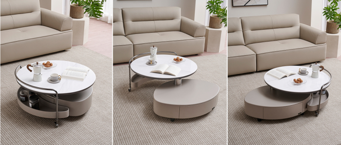 灵动趣变茶几,弧线台面层次错落,不锈钢框架配备静音万向轮,自由移动不拘空间。上层台面+储物框可偏轴旋转,三重形态随心切换,解锁空间新维度。四区开合收纳,顶层、二层、单抽、月牙置物架,按需分区收纳,生活井井有条。微晶玻璃还原天然石纹,耐热防污一擦即净,环保板材承重稳固,双层台面加倍实用。几身全方位圆润设计,圆润边角、无拉手设计、底脚内缩,细节处见贴心。