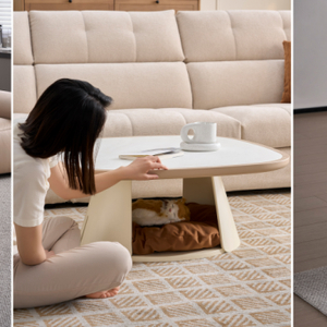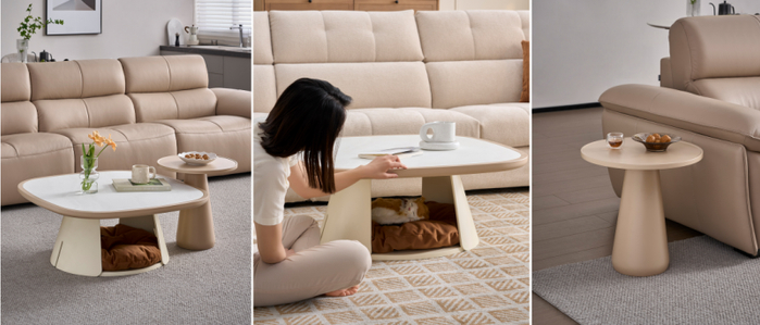 猫窝造型萌趣可爱,奶咖黄搭配奶油白配色,治愈感满满。高低双茶几设计,可搭配组合,可单独使用,适配多样化场景。矮茶几底部镂空配加大方形出口,毛孩子自由进出;亲柔绒布座包一物两用,既是坐垫又是猫窝,温馨舒适;冰花玻璃台面质感升级,纹理自然细腻,有光泽感。高茶几身形小巧,可充分利用角落空间,灵活摆放;圆锥粗壮底座,即便毛孩子撒欢奔跑也不易倾倒,实用与萌趣兼得。