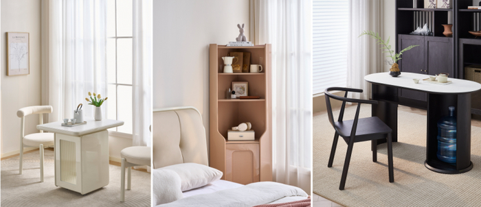 此外,还有多款功能小件家具点亮生活细节。可移动茶台灵动小巧,造型灵感源自“行李箱”,底部自带万向轮,随拉随用。装饰角柜,上下分区储物,可收纳可展示,45°钻石斜边设计,提高空间利用率。中式小茶台,小巧尺寸,精致轻便,圆弧与圆柱双侧不对称底脚,可放下10L水桶,方便取水。
