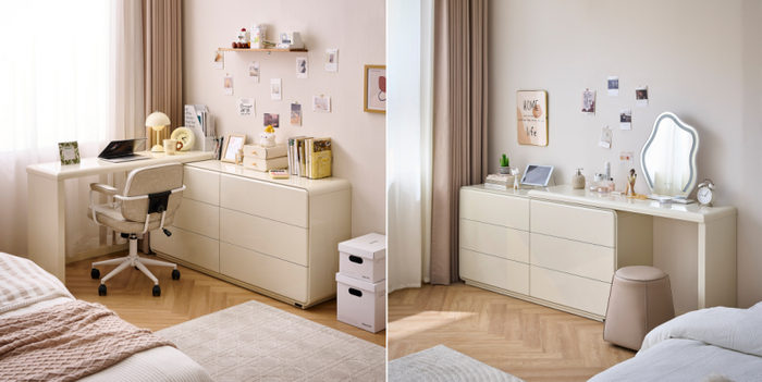 三色斗柜搭配可调节搭台,一物多用,灵活切换梳妆台、书桌、隔厅柜模式,满足不同空间需求。搭台可自定义伸缩,一字型摆放大气简约,L型摆放高效利用鸡肋空间,自由变换不挑户型。四、五、六斗柜容量随心选,扩容储物空间,实用多抽分区收纳,空间更井井有条。梳妆台桌面宽敞,各类物品随心放置。圆润边角柔和安全,搭配无拉手按压设计,防撞更贴心。