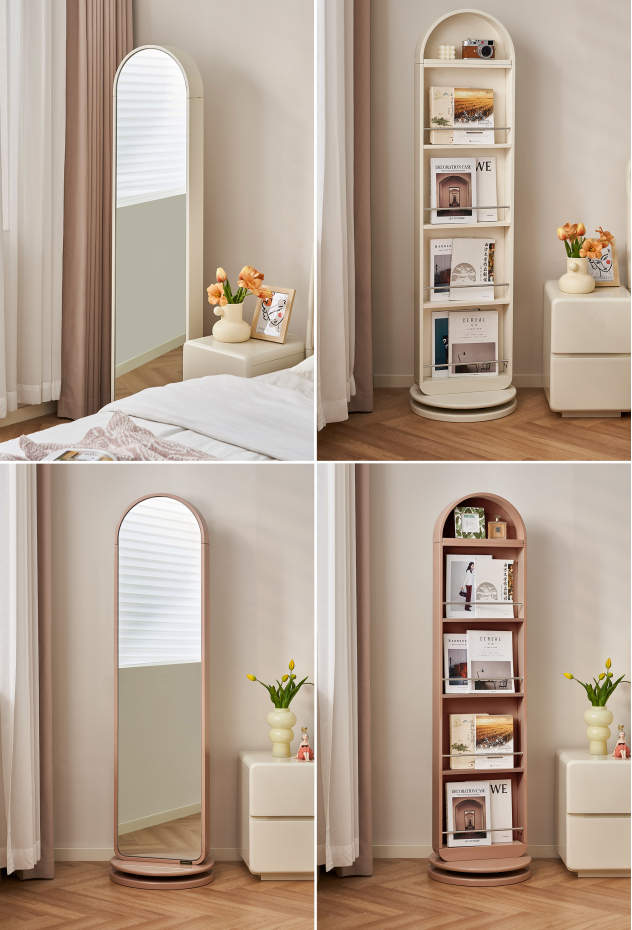 奶油风双面穿衣镜,简洁象牙白、温柔浅蝶粉,一款两色双重美貌,适配原木风、奶油风、简约风等多种装修风格。A面升级加大加厚全身镜,成像清晰平整无畸变,轻松捕捉穿搭细节。B面打造多格分区杂志架,可立体收纳20+本读物,搭配不锈钢加固挡条防滑落,杂志陈列秒变空间装饰。双层加厚底座稳稳贴地,360°静音旋转,从穿搭整理到阅读场景自由切换,美不止一面。