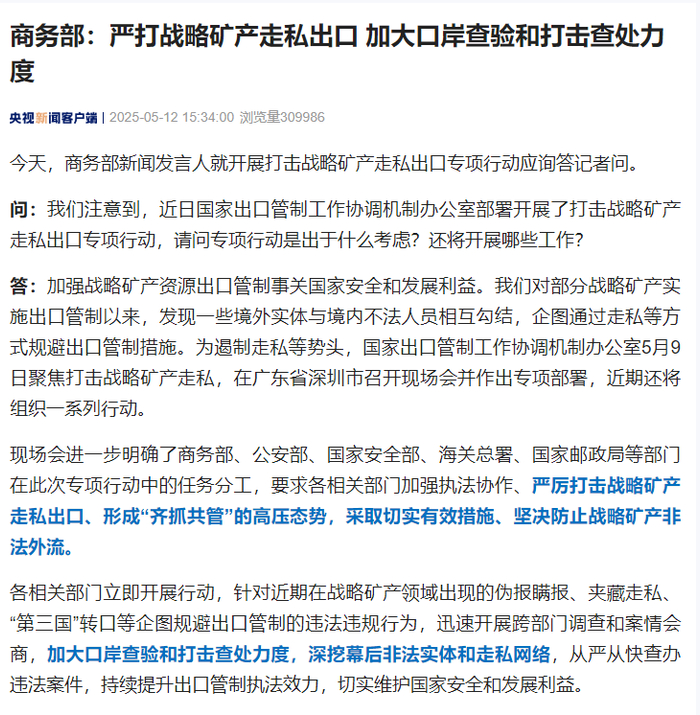 答:加强战略矿产资源出口管制事关国家安全和发展利益。我们对部分战略矿产实施出口管制以来,发现一些境外实体与境内不法人员相互勾结,企图通过走私等方式规避出口管制措施。为遏制走私等势头,国家出口管制工作协调机制办公室5月9日聚焦打击战略矿产走私,在广东省深圳市召开现场会并作出专项部署,近期还将组织一系列行动。