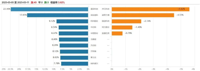 上周(5月5日-5月11日),北证50指数周涨3.62%至1379.31点。北证50成分股中,45只上涨,0只平盘,5只下跌。