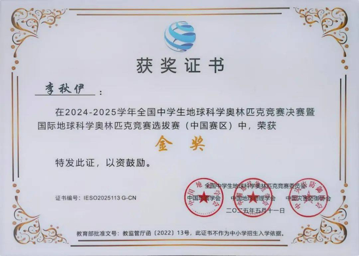 2025年5月9日至11日,2024-2025学年全国中学生地球科学奥林匹克竞赛(简称地科奥赛)决赛在四川成都举行。在学校领导的关怀指导和鼎力支持下,郑州七中师生全力备战、锐意进取,闯入决赛的2位学子取得了突破性的成绩——李秋伊同学获得金奖,焦勇华同学获得铜奖。