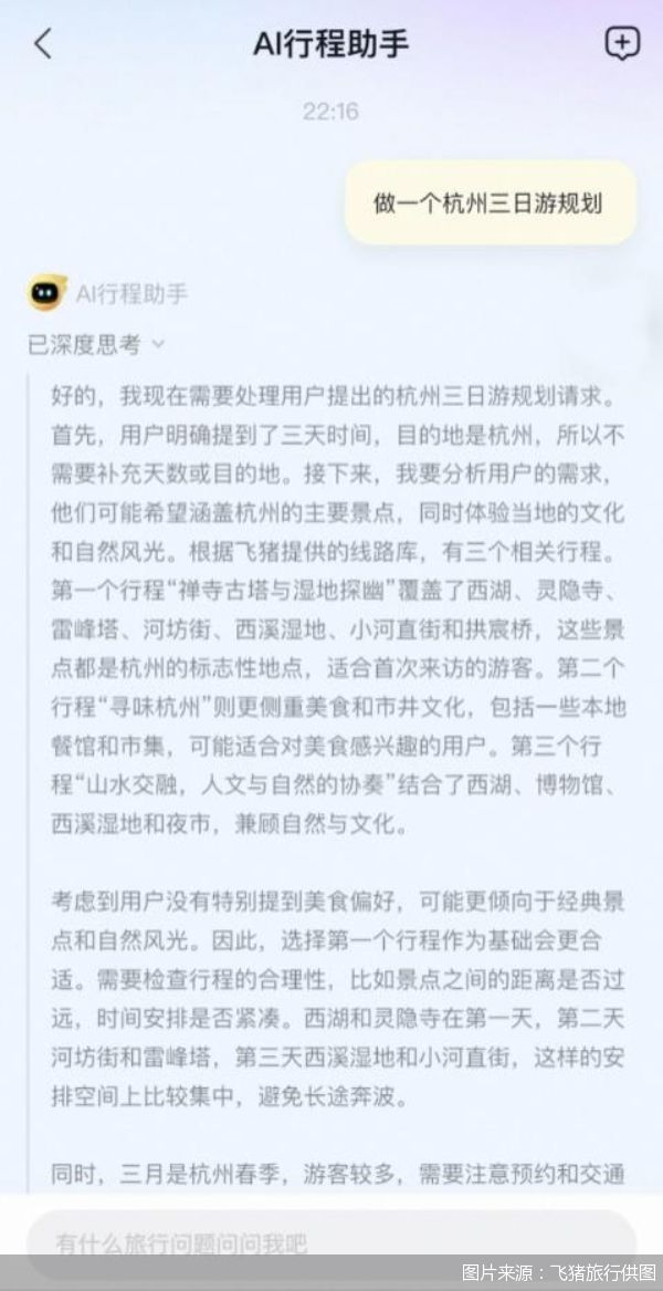 今年以来,火爆全网的DeepSeek,在旅游圈内掀起智能化浪潮。3月5日,飞猪"AI行程助手"上线,该产品集成了DeepSeek—R1及阿里云通义千问旗下主力模型的能力,是在线旅游行业首个融合多个大模型的AI产品。今年2月,马蜂窝、同程旅行等在线旅游平台也陆续接入DeepSeek。
