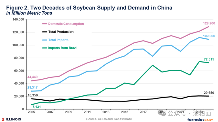 在过去二十年里,巴西对中国大豆市场的依赖加深了,这是由于中国国内大豆需求的持续增长导致对进口的依赖增加。2005年至2024年,中国的大豆消费量从4444万吨增加到1.299亿吨,增长了190%(见图2)。相比之下,同期国内产量增长了26%。这一不断扩大的差距是通过进口来弥补的,进口激增了近300%,仅从巴西的进口就增长了近十倍。