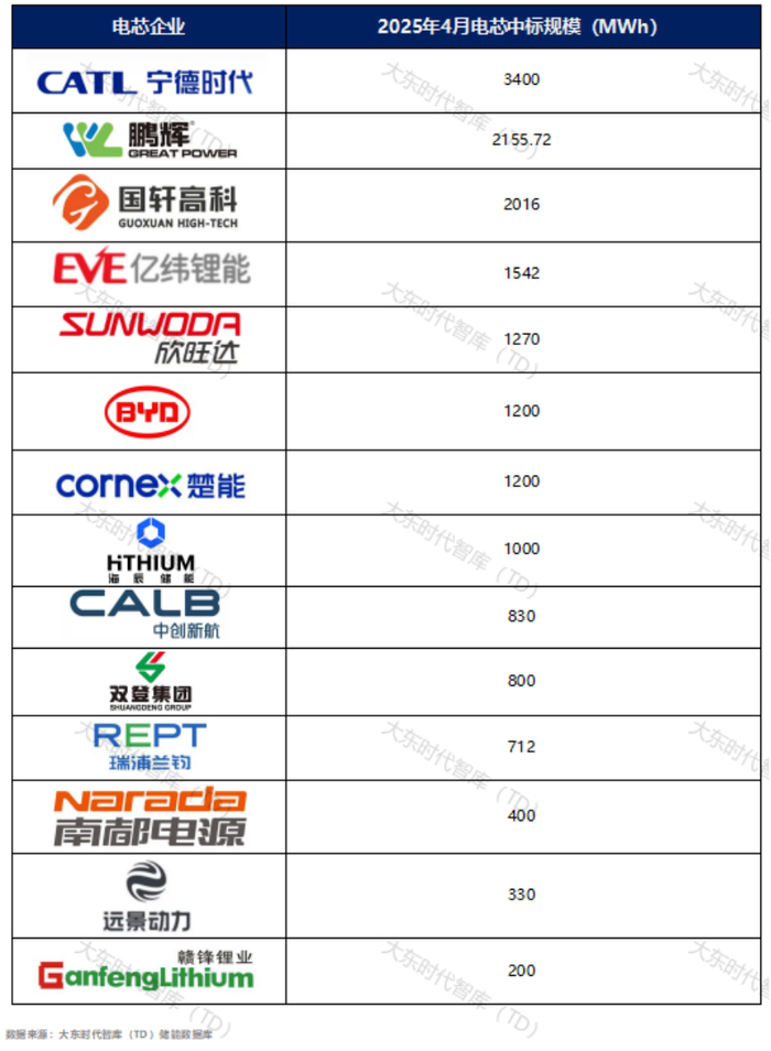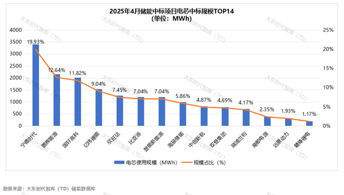 2025年4月储能电芯中标TOP14出炉!宁德时代市占超19%重返第一