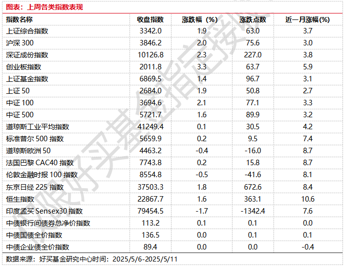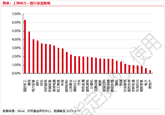 上周,沪深两市双双收涨。截止收盘,上证综指收于3342.00点,涨62.97点,涨幅为1.92%;深成指收于10126.83点,涨227.00点,涨幅为2.29%;沪深300收于3846.16点,涨75.59点,涨幅为2.00%;创业板收于2011.77点,涨63.74点,涨幅为3.27%。两市成交52898.75亿元。总体而言,大盘股强于小盘股。中证100上涨2.13%,中证500上涨1.60%。31个申万一级行业中有31个行业上涨。其中,国防军工、通信、电力设备表现居前,涨跌幅分别为6.33%、4.96%、4.02%,商贸零售、电子、房地产表现居后,涨跌幅分别为0.88%、0.64%、0.41%。