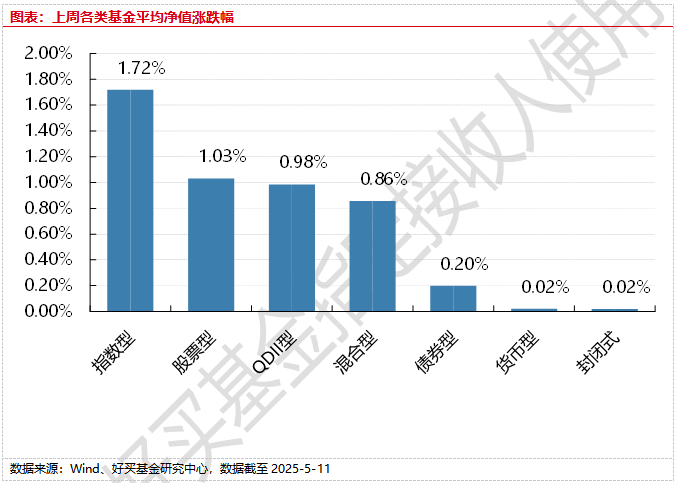 上周,国内基金全部上涨,其中股票型基金上涨1.03%,指数型上涨1.72%,混合型上涨0.86%,QDII基金上涨0.98%,债券型上涨0.2%。