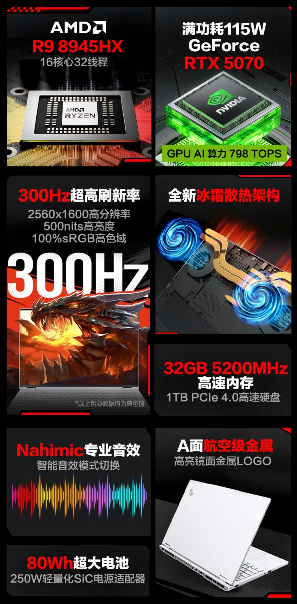这款游戏本采用了 AMD R9-8945HX 处理器,搭配32GB 的 DDR5 5200 内存 + 1TB PCIe 4.0 硬盘,采用全新冰霜散热架构,RTX 5070 显卡性能释放 115W,AI 算力可达 798TOPS。