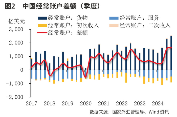 货物贸易推动经常账户顺差再创新高。2024年经常账户顺差为历史次高水平,仅低于2022年。分季度看,经常账户顺差逐季扩大,第四季度扩大至1638亿美元的历史最高水平。具体而言,在“抢出口”的推动下,货物贸易顺差在2024年第四季度升至2498亿美元的历史最高水平。服务贸易逆差与2023年几近持平,其中旅游项逆差较2023年扩大299亿美元,贡献了总逆差的94%,一方面源于居民出行需求旺盛,另一方面也可能由于居民以旅行需求购汇所致;运输项逆差同比收窄约301亿美元,特别是2024年下半年显著收窄,反映出货物出口高增长下,运输服务收入同步增加。2024年,国际收支口径货物和服务贸易顺差5506亿美元,同比增长46%。货物和服务净出口拉动实际GDP增速1.5个百分点,对经济增长贡献达30.5%,为1997年以来最高水平,显示出外需是支撑中国经济增长的重要引擎。