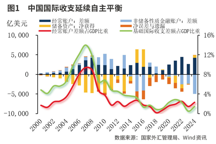 2024年,中国经常账户顺差4239亿美元,占GDP比重2.29%,较2023年回升0.8个百分点,维持在合理均衡水平,经济延续内外均衡。非储备性质金融账户逆差4962亿美元,储备资产净获得629亿美元,国际收支延续自主平衡。基础国际收支顺差2702亿美元,较2023年扩大1801亿美元,占GDP比重1.43%,长期资本流入增加。